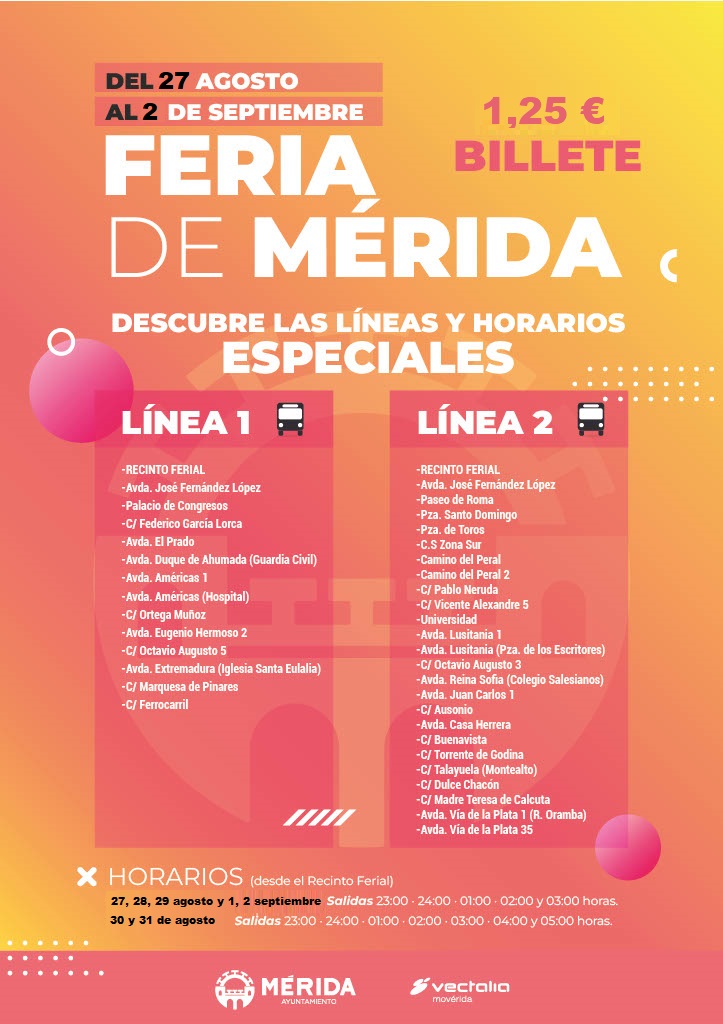 Las dos líneas especiales de feria comenzarán desde el recinto ferial a las 23 hrs, con una hora de frecuencia con las siguientes salidas: